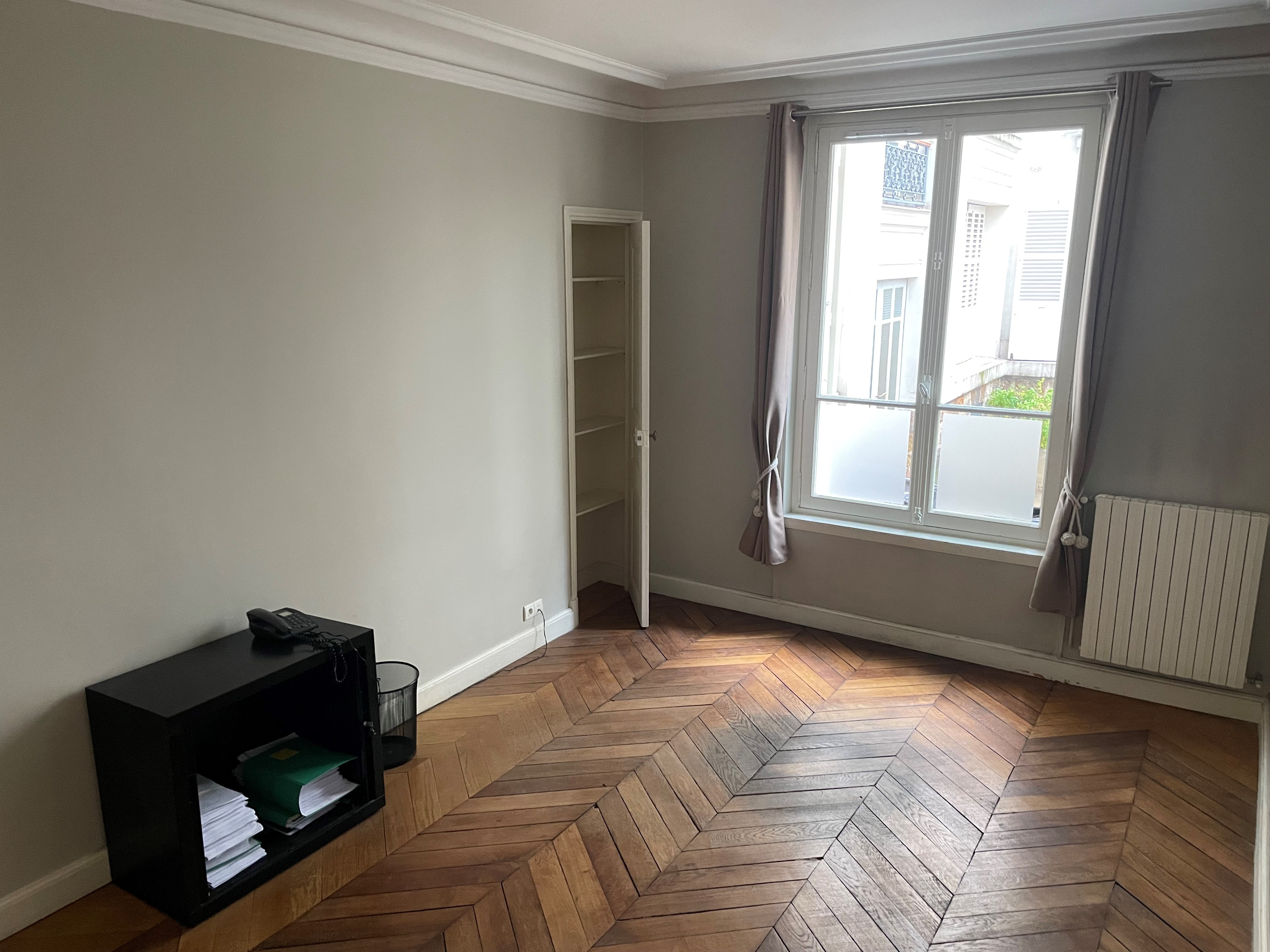 Bureau spacieux avec un placard de rangement, fenêtre sur cour, calme, parquet ancien au sol.